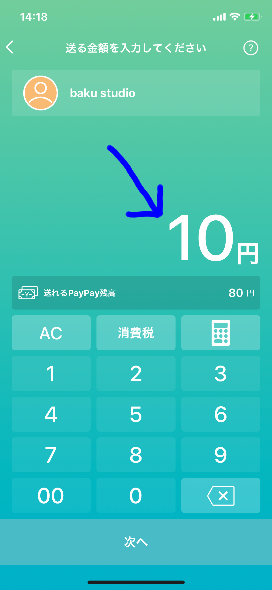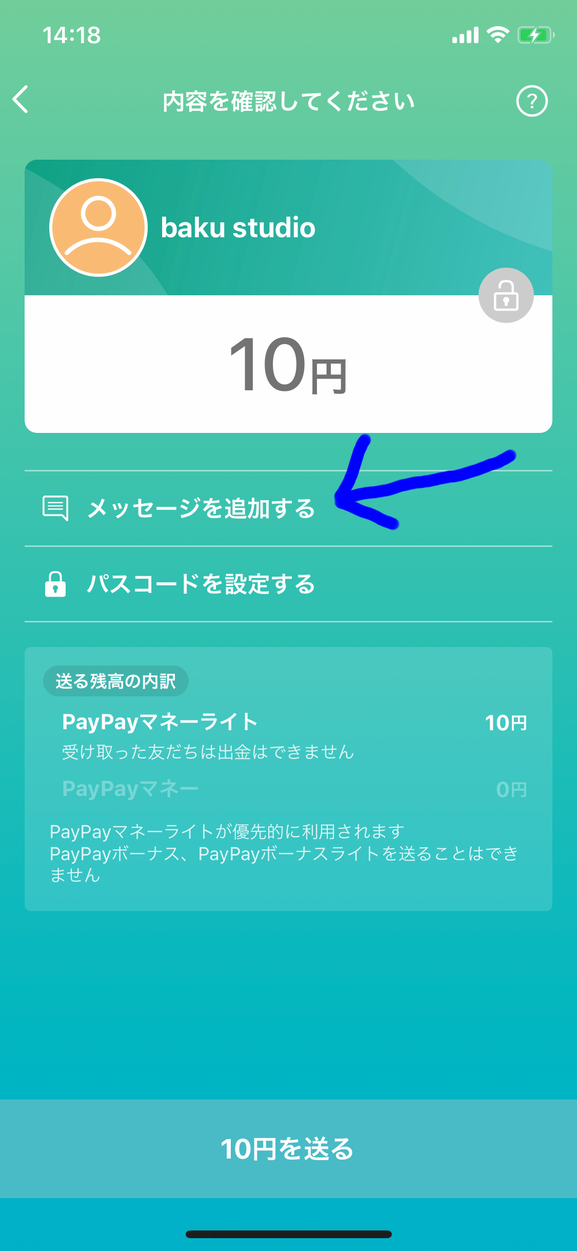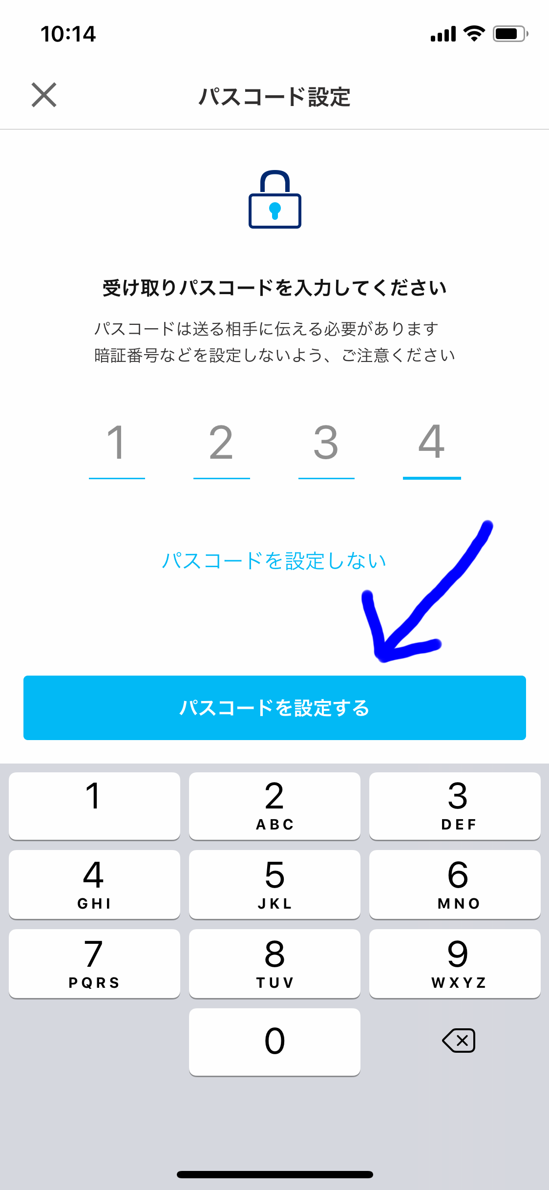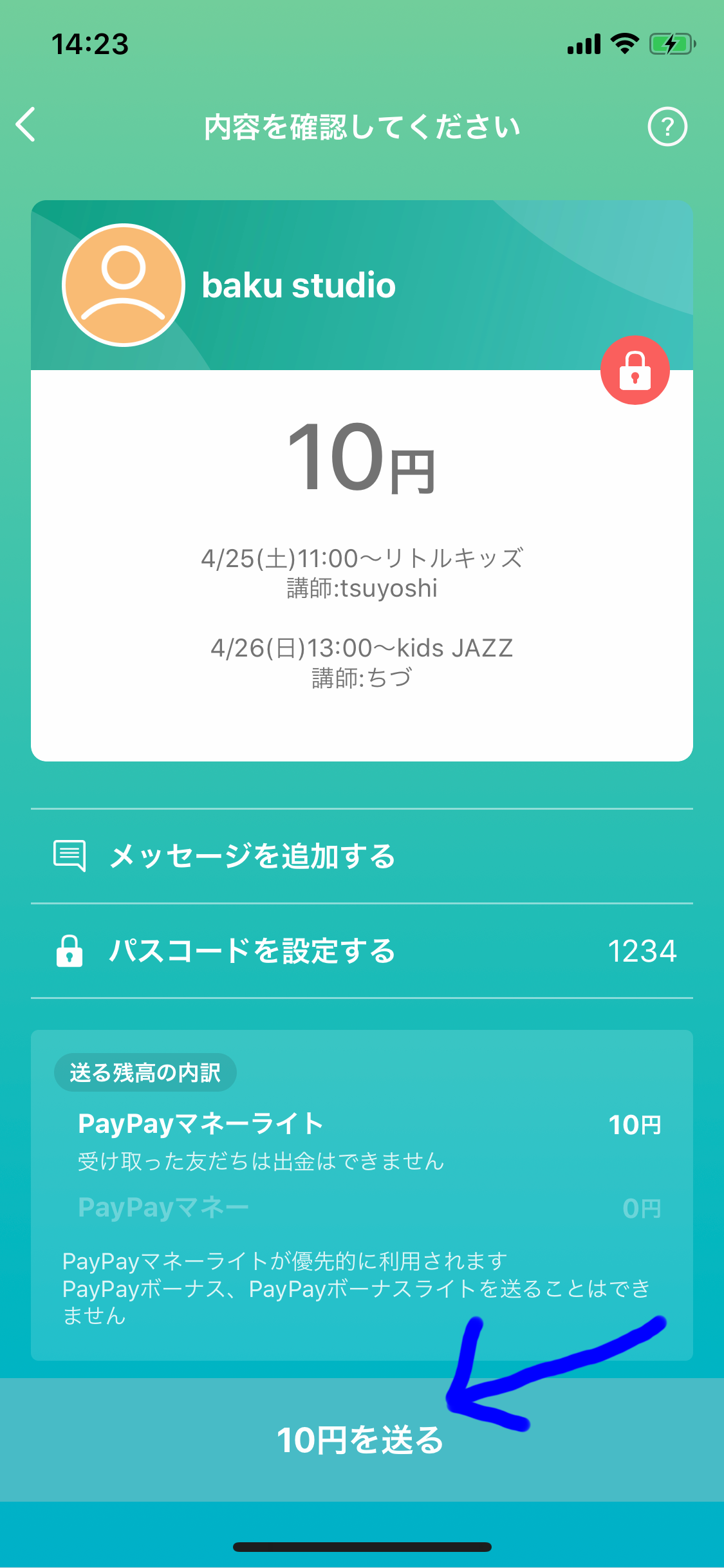 ⑤お好きな数字のパスコードを設定して[○○円を送る]