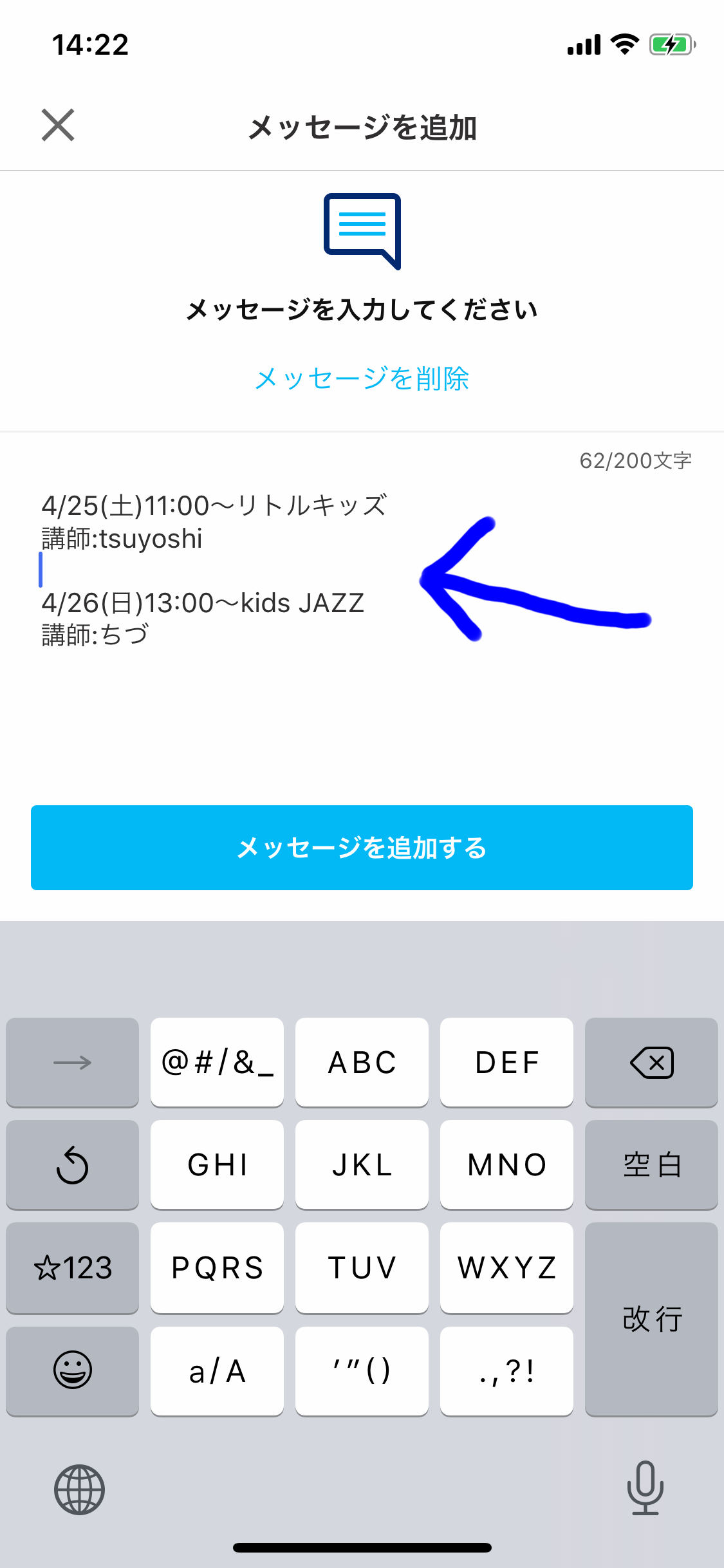 ④「メッセージを追加する」に受講レッスン日時と講師名をご入力下さい。