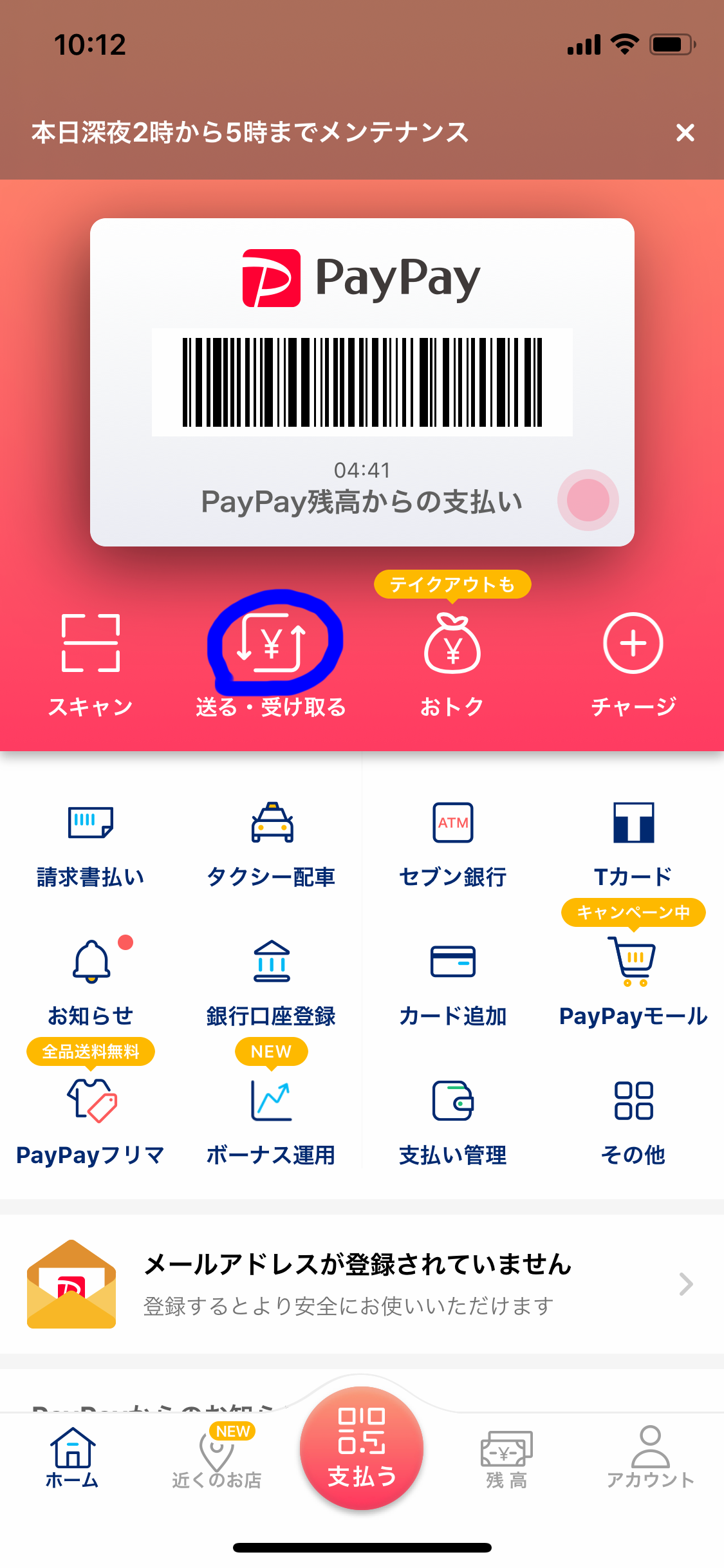 ①paypayアプリを開き 送る・受け取るを選択