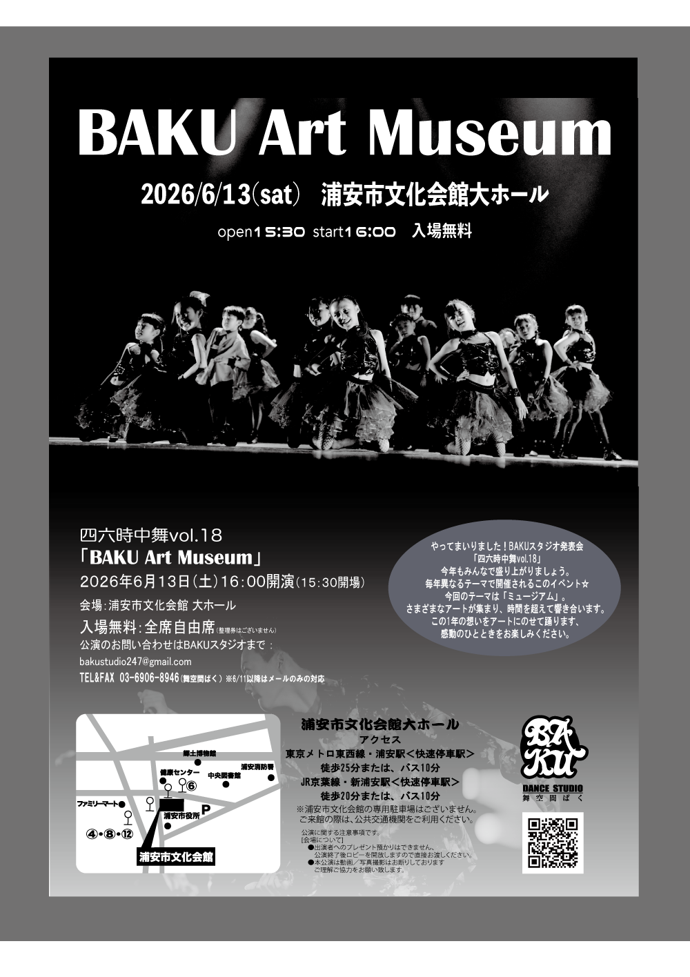 「四六時中舞vol.18」〜BAKU ART MUSEUM〜場所:浦安市文化会館大ホール開催日:2026年6月13日(土)16時開演(15:30開場)